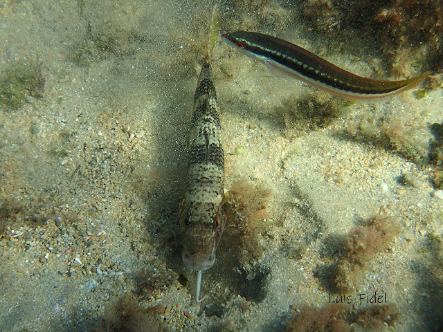 Todo empezó como empiezan casi todas las cosas, por casualidad. Después de un tiempo sin bucear, vuelves con más intensidad, con más ganas de observar la naturaleza en la mar. En un principio buscaba fotografiar seres de forma individual (a veces complicado de hacer). Hasta que me di de bruces con los Salmonetes de roca (Mullus surmuletus). Siempre solían ir acompañados de otras especies. Eso al principio me molestaba, no podía hacer la fotografía que yo quería. No entendía las especiales relaciones que se forman en la vida. Los salmonetes remueven el fondo buscando comida, alimentándose. Otras especies suelen estar a su alrededor comiendo lo que no come el salmonete. Rápidamente me acorde de mi profesora de biología y de una de sus clases, las relaciones de los seres vivos. Entre ellas esta el comensalismo. La asociación biológica externa entre dos especies para beneficio alimenticio de una de ellas o de ambas, sin causarse perjuicio entre ellas.